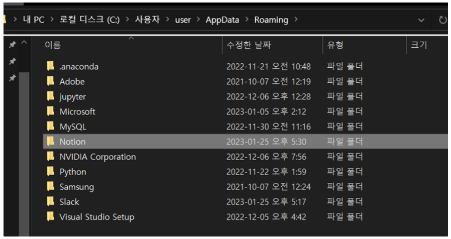 C:\Users\[사용자명]\AppData\Roaming 폴더에 있는 ‘Notion’ 폴더를 삭제!! 하고 실행시켜보자