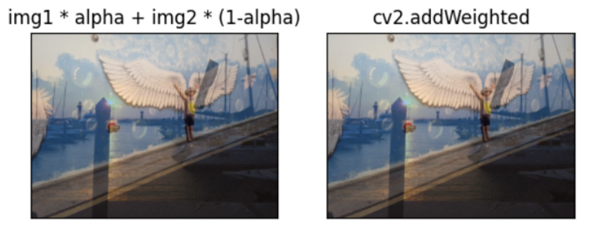 - cv2.addWeight(img1, alpha, img2, beta, gamma)