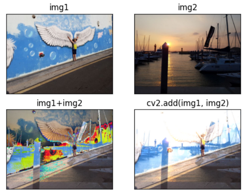 직접 더하기 연산을 하면 255를 넘는 경우 초과 값만을 가지게 되므로 영상에서 튀는 색상들이 나타나거나 거뭇거뭇하게 나타나고, cv2.add() 연산을 하면 초과값이 255가 되므로 픽셀 값이 255 가까이 몰리는 현상이 일어나서 하얗게 날아간 것처럼 보인다.
