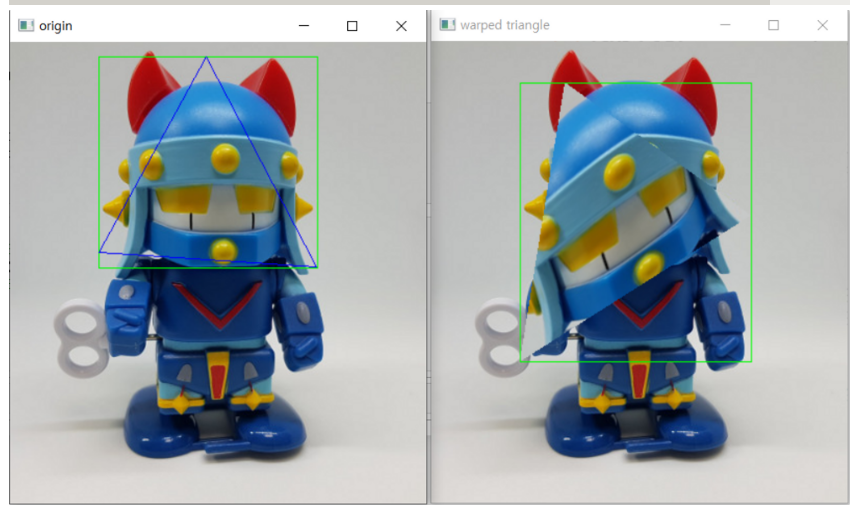 삼각 분할된 영역을 변환하기는 쉽지 않다. OpenCV가 제공하는 기하학적 변환 기능은 영상을 대상으로 하므로 그 대상은 늘 사각형일 수밖에 없기 떄문이다. 그래서 삼각형 모양의 변환을 하려면 다음과 같은 과정을 거쳐야 한다.