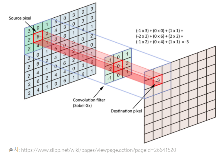 n x n 크기 커널의 각 요소와 대응하는 입력 픽셀값을 곱해서 모두 합한 것을 결과 픽셀값으로 결정하고, 이것을 마지막 픽셀까지 반복하는 것을 컨볼루션 연산이라고 한다.