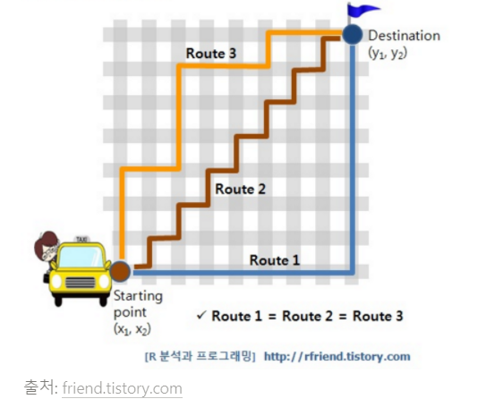 점과 점 사이의 직선 거리가 아니라 X축과 Yㅊ푹을 따라 간 거리를 의미한다.
