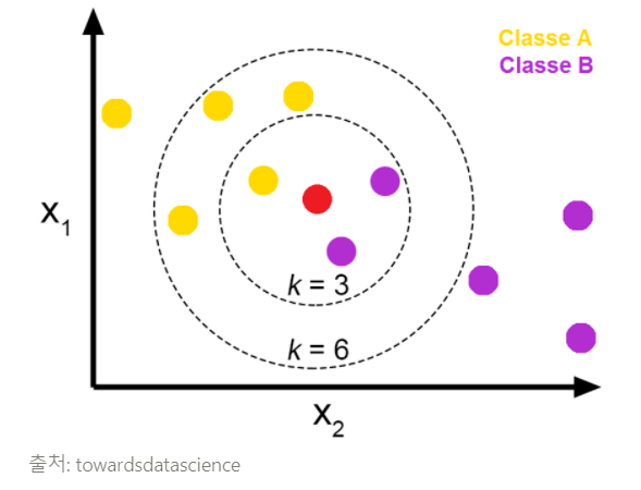 - k=3(안쪽 원)일 때, 노란색 점(Class A) 1개와 보라색 점(Class B) 2개가 있다. 따라서 k=3일 때 빨간 점은 B로 분류 된다.