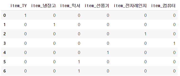 df = pd.DataFrame({'item':['TV', '냉장고', '전자레인지', '컴퓨터', '선풍기', '믹서', '믹서']})